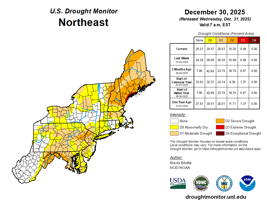 December precipitation generally ranged from less than 50% of normal in places like eastern West Virginia, south-central Pennsylvania, and parts of Maryland up to 150% of normal in spots such as western, central, and northern New York. However, most of the Northeast was drier than normal. December precipitation at the region’s 35 major sites ranged from 39% of normal in Baltimore, MD, and Dulles Airport, VA, to 146% of normal in Syracuse, NY. This December was the 10th driest on record for Dulles Airport and the 20th driest for Baltimore but was the 11th wettest for Syracuse. During the month, drought expanded in some areas that were notably dry such as Massachusetts and central parts of the Mid-Atlantic but slightly improved in some wetter areas like western New York and southeastern West Virginia.