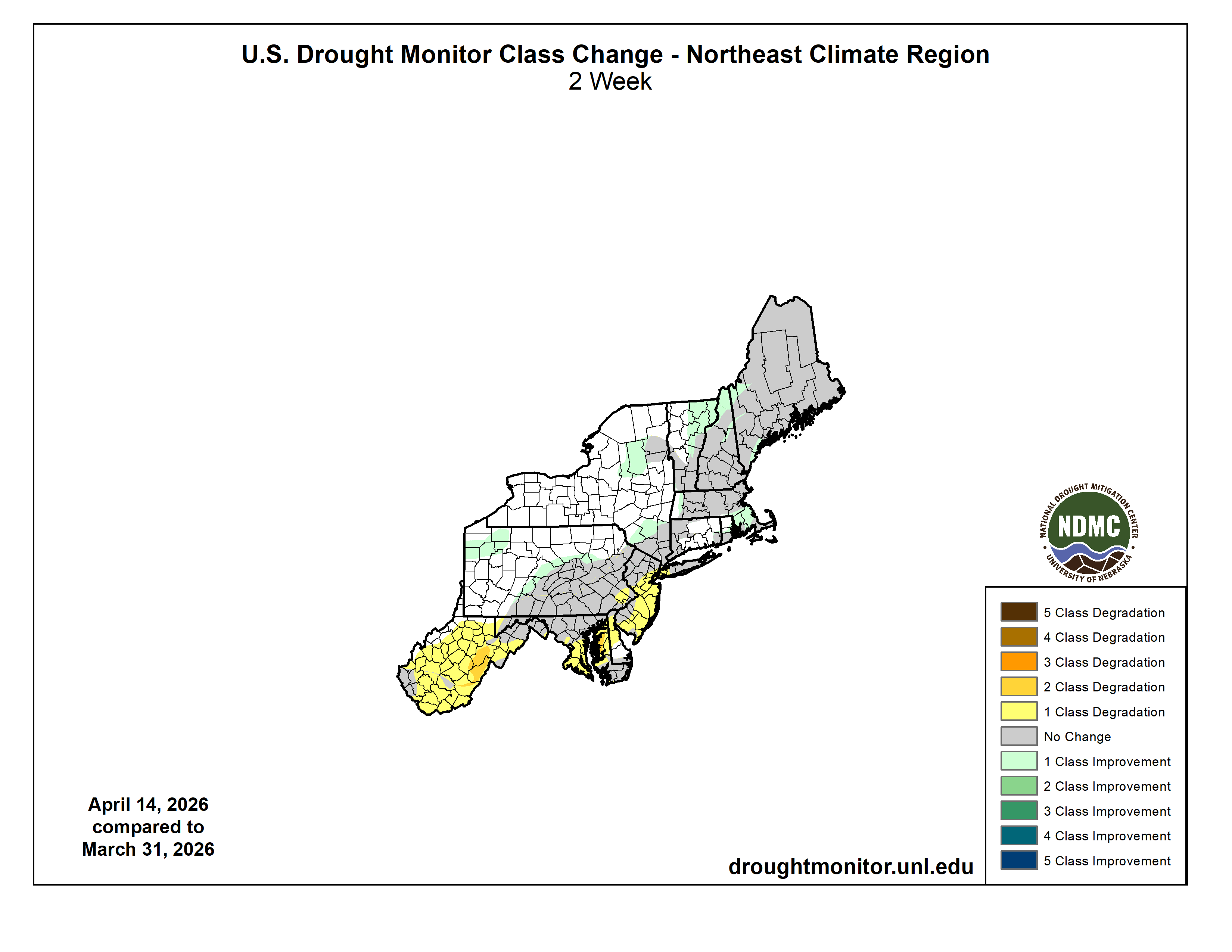 Precipitation during the first two weeks of April ranged from less than 25% of normal in places like the New York City metro area to over 200% of normal in locations such as northern Maine, western New York, and northwestern Pennsylvania. In general, areas closer to the coast, as well as much of West Virginia, saw below- or near-normal precipitation, while northern locations saw near- or above-normal precipitation. April 1-15 precipitation at the region’s 35 major sites ranged from 14% of normal in Bridgeport, CT, to 172% of normal in Caribou, ME, with 26 of the sites being on the dry side. This April 1-15 period ranked among the 20 driest such periods on record for 10 major sites but was Caribou’s sixth wettest. Drought and abnormal dryness expanded in some of the drier locations but improved in some of the wetter locations.