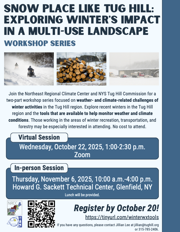 Northeast Regional Climate Center and NYS Tug Hill Commission collaborated for a two-part workshop series focused on weather- and climate-related challenges of winter activities in the Tug Hill region. Exploring recent winters in the Tug Hill region and the tools that are available to help monitor weather and climate conditions.